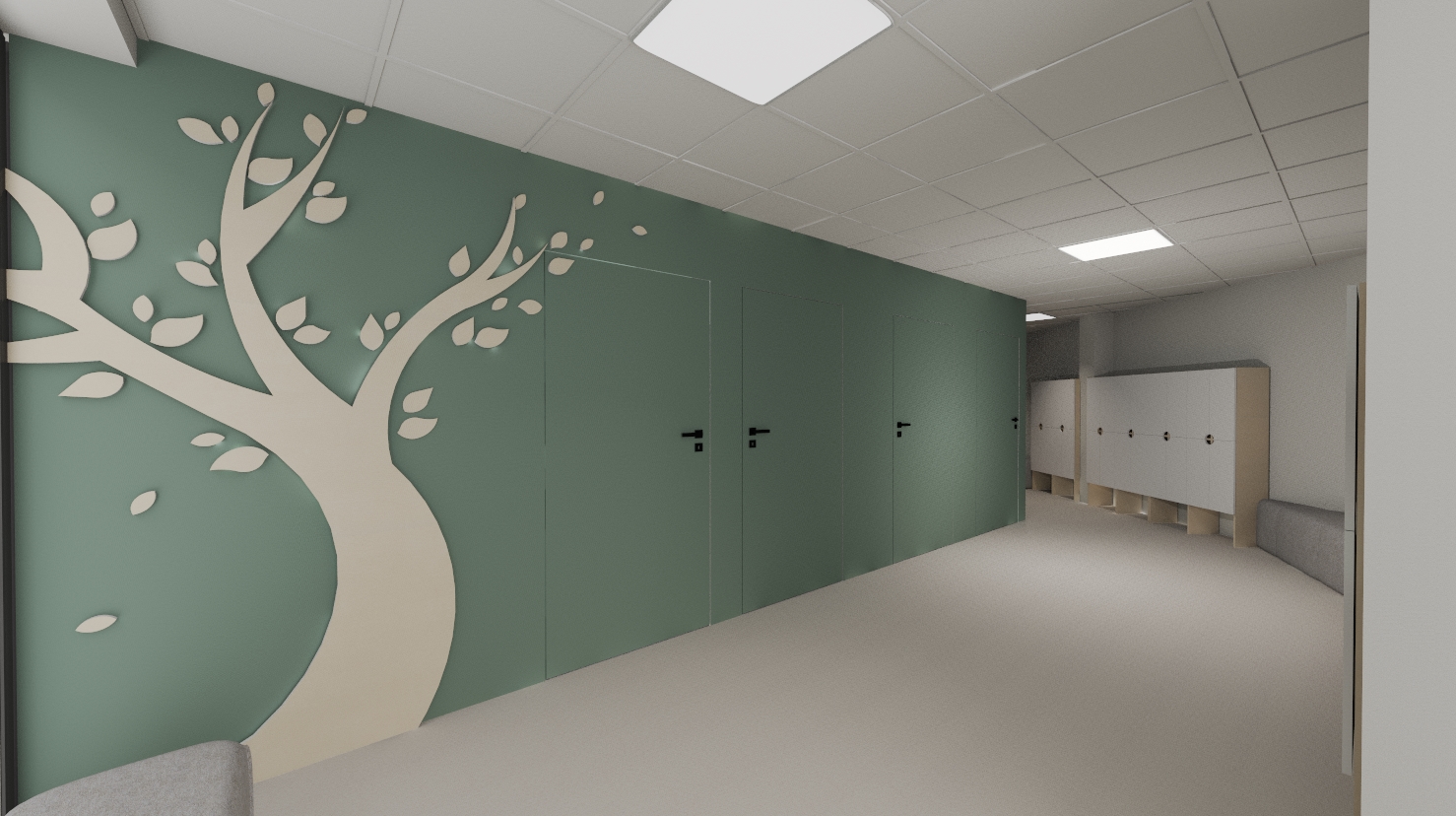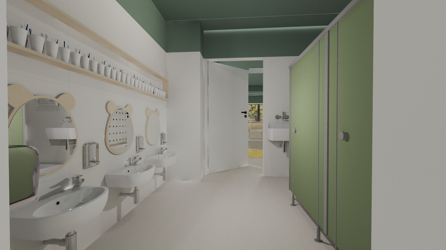 Żłobek posiada również nowoczesne łazienki zaprojektowane z myślą o wygodzie i samodzielności dzieci. Duże okna wpuszczają naturalne światło, tworząc jasne i przyjazne wnętrza.