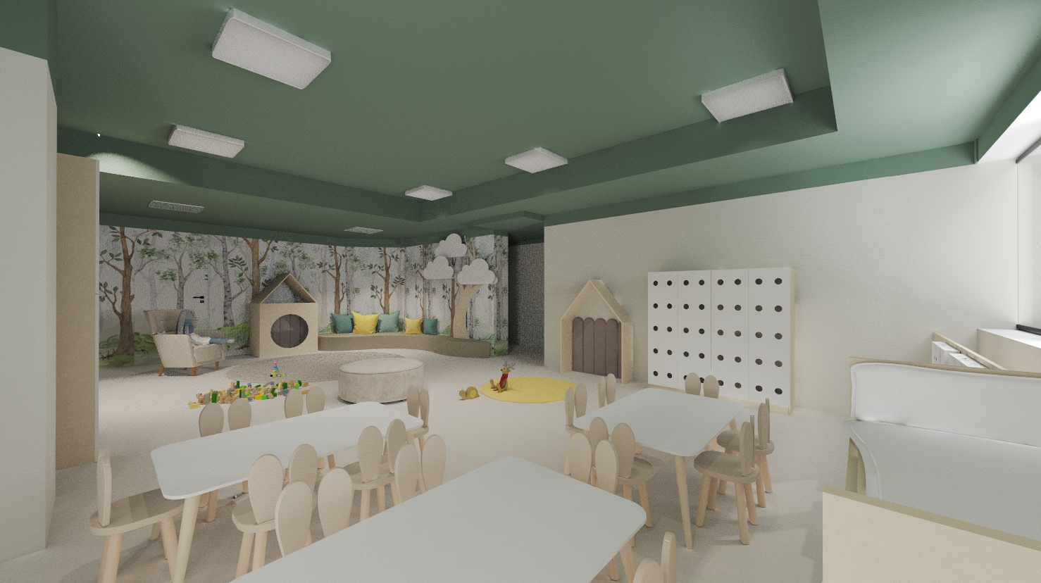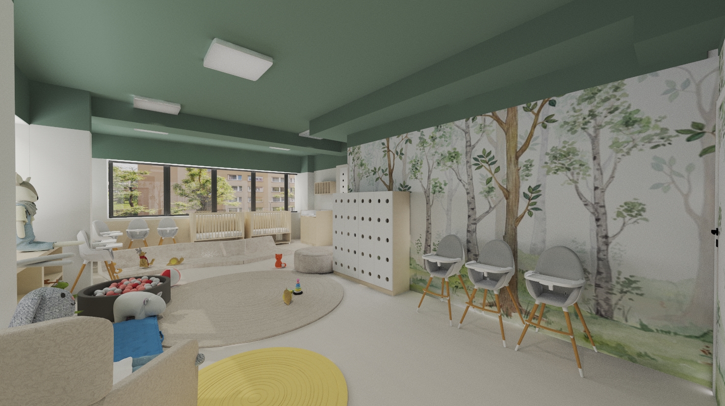 Wnętrza żłobka zaprojektowano z myślą o bezpieczeństwie, komforcie i wszechstronnym rozwoju dzieci. Motywem przewodnim wystroju jest zaczarowana polana, która zachęca maluchy do odkrywania świata w otoczeniu natury i bajkowych bohaterów. Każda sala posiada swojego patrona – Królika, Misia lub Liska – którzy stają się przyjaciółmi dzieci podczas codziennych aktywności.